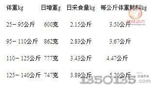 五、養大豬改為適宜出欄:肉豬出欄根據育肥期日增重和料肉比,屠宰后的屠宰率和瘦肉率、生產成本等三個方面。由于飼料占養豬成本較大,所以日增重和料肉比在出欄體重上是首要指標。據試驗說明:肉豬不同階段日增重和料肉比為:
